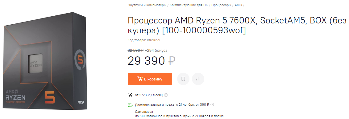 Наконец, наиболее доступная модель серии Ryzen 7000 в лице Ryzen 5 7600X, наделённая 6 ядрами/12 потоками, сейчас предлагается за $249 против $299 днём ранее.