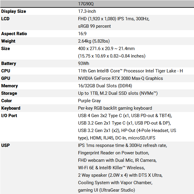 Покупатели смогут выбрать LG UltraGear 17G90Q с 16 или 32 ГБ памяти DDR4, используя два слота и до 1 ТБ M.2 PCIe SSD (2 слота предусмотрены).
