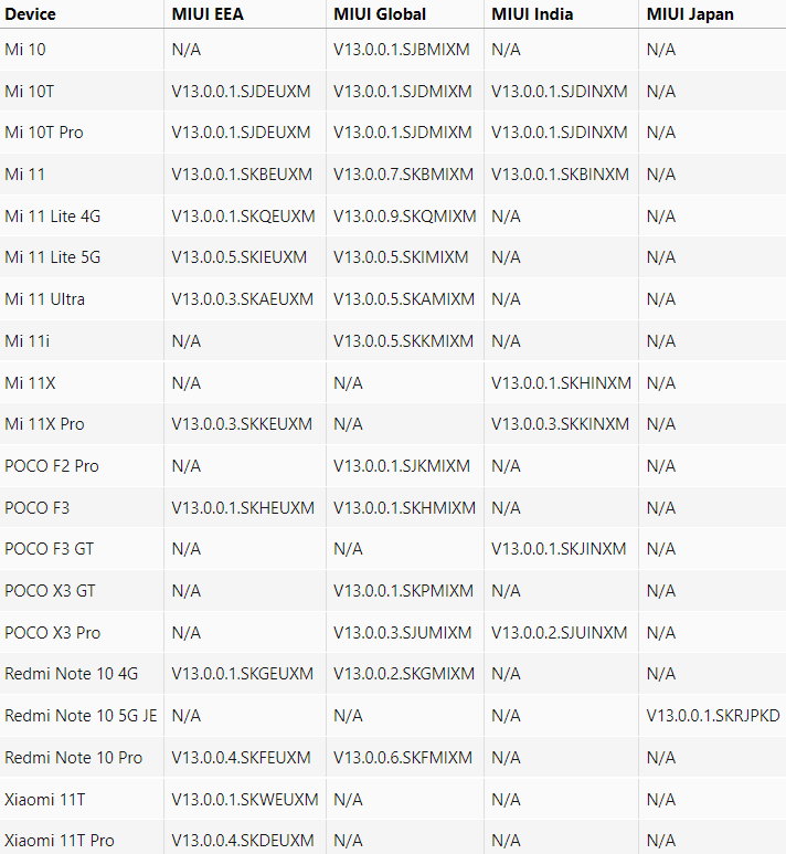 Согласно информации ресурса Xiaomiui, Xiaomi намерена на начальном этапе обновить 20 устройств до MIUI 13 за пределами Китая. Как показано в таблице ниже, хотя не все устройства являются флагманами, например Mi 11 Lite 4G и Redmi Note 10 4G, тем не менее, новая версия оболочки MIUI 13 будет основана на ОС Android 12 для всех этих моделей, о чём свидетельствует буква S после цифр в номерах сборок.