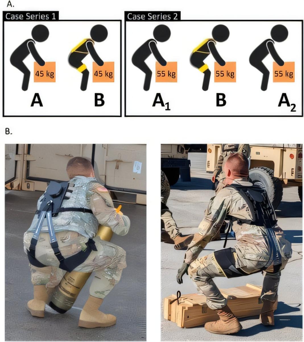 Для оценки выносливости при подъеме применялись различные методики. В первом сценарии (A, B-тест) участники выполняли подъемы 45-килограммового груза до полного утомления сначала без экзоскелета, а затем, надев его. Во втором сценарии (A1, B1, A2 - тест) испытуемые поднимали 55 кг, последовательно меняя условия: без экзоскелета, затем с ним, и снова без него. Иллюстрации, сопровождающие исследование, демонстрируют участников, использующих экзоскелет в обоих сценариях, а также типичные рабочие грузы. (Источник: Wearable Technologies (2024). DOI: 10.1017/wtc.2024.8)