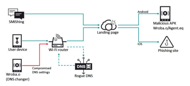Вредоносное Android-приложение называется Wroba.o и не первый год встречается в таких странах, как США, Франция, Япония, Германия, Тайвань и Турция. При этом перехват DNS применяется почти всегда только в Южной Корее. С 2019 до прошлого года злоумышленники заманивали пользователей на вредоносные сайты рассылкой текстовых сообщений, но потом перешли на перехват DNS.