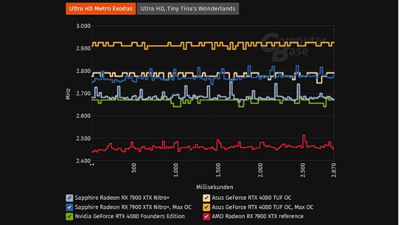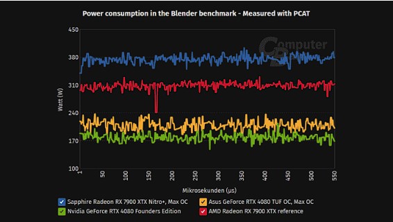 В лаборатории ComputerBase использовались карты Sapphire Radeon RX 7900 XTX Nitro и GeForce RTX 4080 TUF OC, обе модели были изготовлены по индивидуальному заказу. ComputerBase сообщает, что эталонный дизайн RX 7900 XTX бесполезен для данного теста, поскольку не обладает необходимой частотой и предел его мощности ограничен 408 Вт.