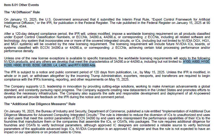 Что касается сроков, то уже известно, что правила вступят в силу 15 мая 2025 года, если администрация Трампа их не отменит — до этого пройдёт 120-дневное обсуждение. Nvidia пока не комментирует свои убытки, однако в документах предупреждает инвесторов о рисках. При этом аналитики считают, что компания, чьи чипы сейчас «разлетаются как горячие пирожки», может столкнуться с падением спроса в среднесрочной перспективе из-за бюрократических барьеров.