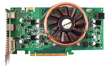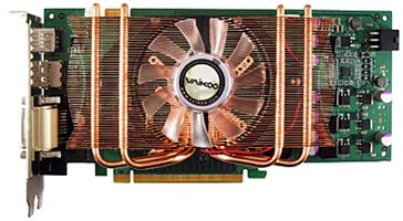 "Обычная" версия GeForce 9600 GT от VVIKOO оснащается кулером Zalman VF900-Cu, что позволяет ей отличаться от эталонных аналогов. Частоты остались стандартными - 650/1625/1800 МГц. На задней панели, которая оснащена двухъярусной планкой, разместились порты DVI, HDMI и S-Video.