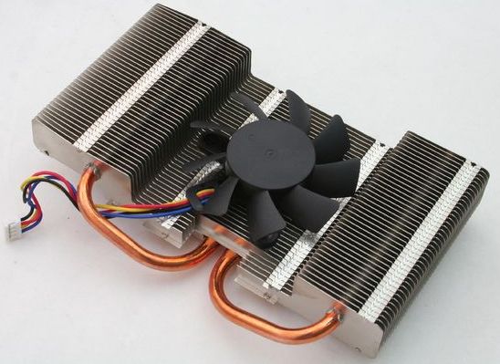 Как видите, и в этом случае не обошлось без тепловых трубок и расположенного по центру вентилятора. Последний, кстати, питается от четырёхконтактного разъёма, что говорит о возможности гибкого управления скоростью вращения и мониторинга температуры.