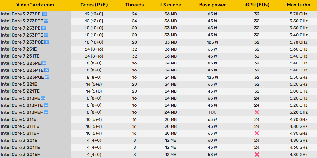 Судя по представленной таблице, старшие модели, Core 9 273PQE, 273PE и 273PTE получат 12 P-ядер, 36 МБ L3-кэша и могут разгоняться до 5,9; 5,7 и 5,5 ГГц, тогда как процессоры Core 7 253PQE, 253PE и 253 PTE оснастят 10 P-ядрами с частотой до 5,7; 5,5 и 5,4 ГГц соответственно, а также 33 МБ кэша третьего уровня.
