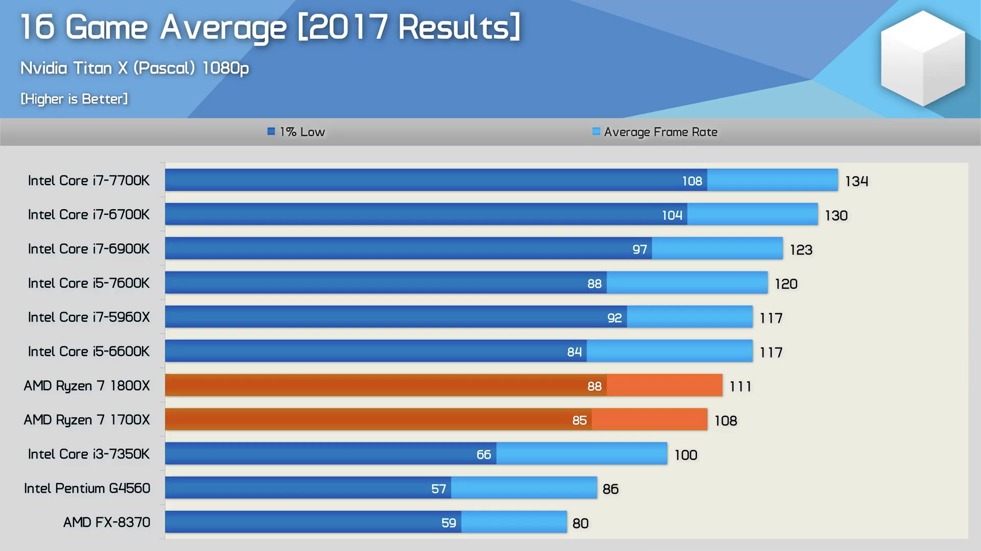 На сегодняшний день 8-ядерные CPU используются в играх гораздо эффективнее. Однако, тест Hardware Unboxed показывает, что даже в 2026 году Core i7-7700K в среднем на 13% быстрее Ryzen 7 1800X в разрешении 1080p и при средних настройках качества.