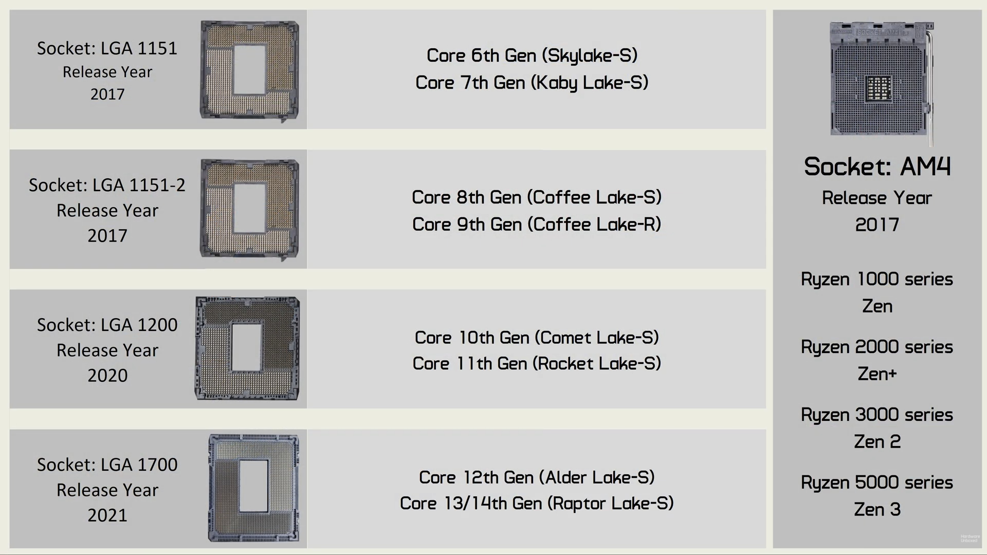 В результате, для того, чтобы хотя бы приблизиться к Ryzen 7 5800X3D по FPS в играх, Intel пришлось выпустить четыре несовместимых между собой сокета: LGA 1151, LGA 1151 v2, LGA 1200 и LGA 1700.