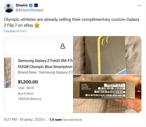 Источник: скриншот X / @ShishirShelke1Согласно объявлению на eBay, смартфон представляет собой Galaxy Z Fold 3 с 12 ГБ оперативной памяти и 512 ГБ встроенной памяти. Однако фотографии и серийный номер показывают, что на самом деле это Samsung Galaxy Z Flip 7 Olympic Edition.