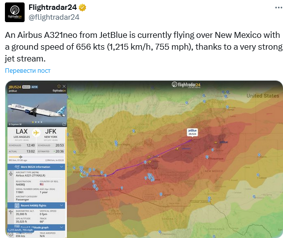 Самолет Airbus A321neo авиакомпании JetBlue достиг скорости 1215 км/ч во время полета из Лос-Анджелеса в Нью-Йорк. Эта информация получена из данных отслеживания, записанных 17 февраля для рейса JB524. Самолет вылетел из Лос-Анджелеса и приземлился в аэропорту имени Джона Кеннеди в Нью-Йорке на 39 минут раньше запланированного времени. Об этом сообщило издание Simpleflying.