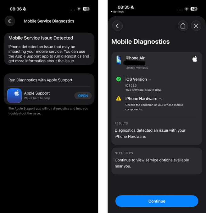 Он зашёл в сетевые настройки, и телефон отобразил опцию диагностики. Программное обеспечение iOS 26 проверило работу устройства, и проблема оказалась аппаратной. Пользователь увидел сообщение «Диагностика обнаружила проблему с аппаратной частью iPhone».