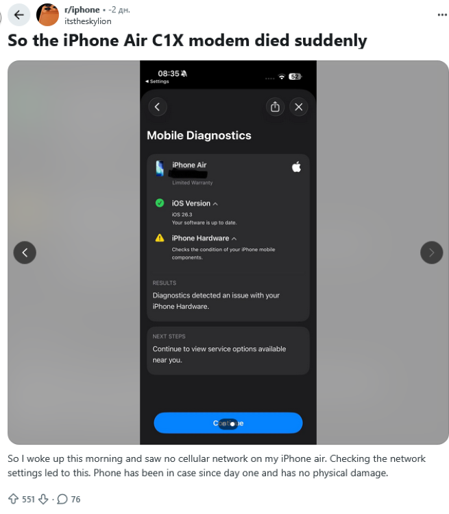 Источник: reddit.com / itstheskylionСистема не указала явно, что модем Apple C1X работает некорректно. Учитывая, что iPhone Air не смог подключиться к сотовой сети, неисправным компонентом является модем Apple C1X. Wi-Fi сеть основана на другом чипе Apple N1.