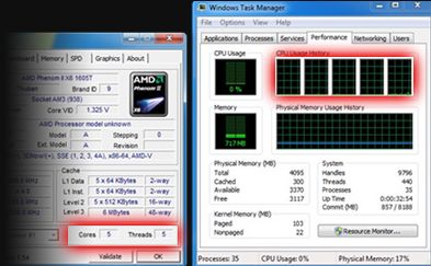 Пользователи могут включать два дополнительных ядра у процессоров Phenom II X2 5xx и одно ядро у Phenom II X3, пока AMD не решилась выпустить на розничный рынок "шестиядерные заготовки для трансформаций".