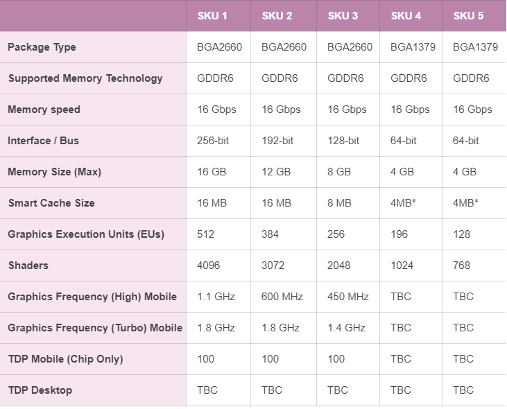 Прежде всего, подтверждается разделение на две группы, в первую войдут компоненты в исполнении BGA 2660 с количеством исполнительных блоков от 256 до 512 штук, во вторую – чипы в более компактном исполнении BGA 1379 с 96 или 128 исполнительными блоками. В первом случае габаритные размеры упаковки чипа составят 43 х 37,5 мм, во втором – 29 х 29 мм. Добавим, что иллюстрация не является фрагментом презентации Intel, для изучения искомого материала необходимо обратиться к первоисточнику.