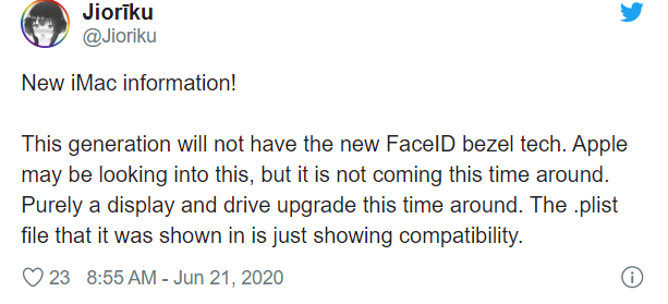 Также сообщается, что iMac 2020 года получит чип безопасности T2 и графику AMD Navi. Jioriku не подтвердил, сколько моделей будет доступно в будущем, но более ранние слухи говорили о том, что Apple также работает над доступным 23-дюймовым iMac.