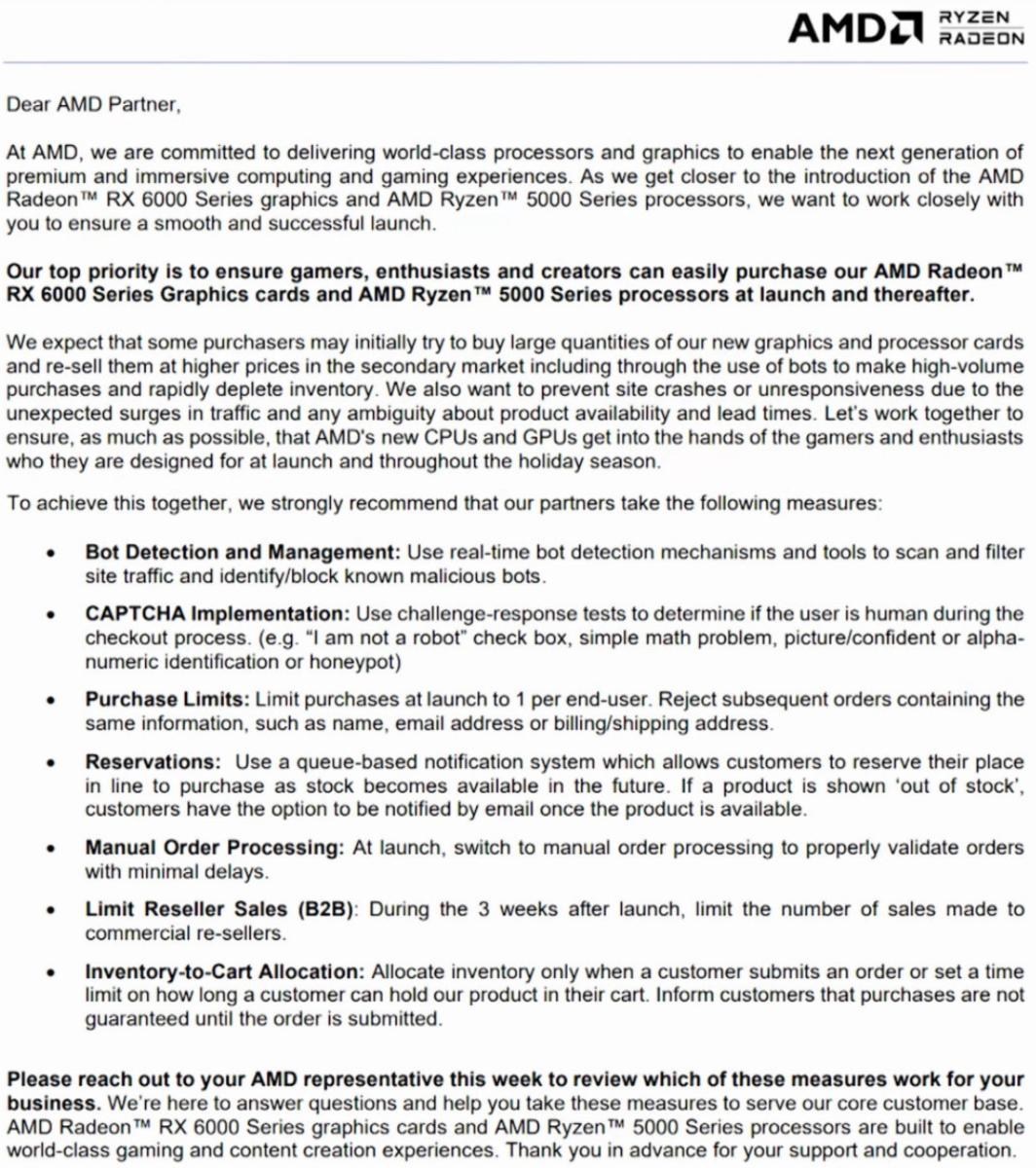 С приближением выпуска видеокарт AMD Radeon RX 6000 и процессоров Ryzen 5000 AMD выпустила список рекомендаций, которым розничные торговцы должны следовать, чтобы избежать дефицита новых видеокарт и процессоров.