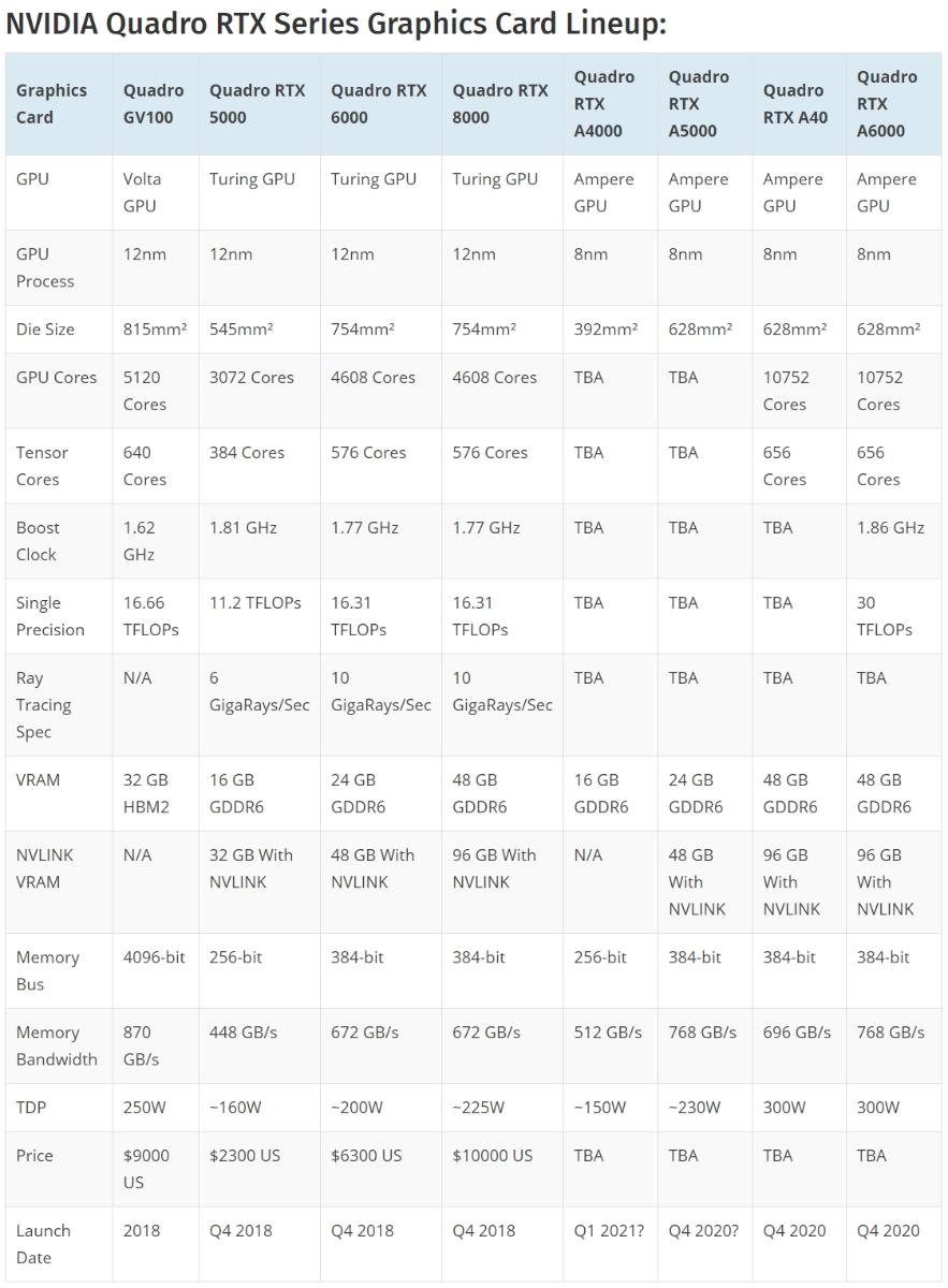 NVIDIA RTX A6000 была анонсирована в этом месяце и после отказа от бренда Tesla NVIDIA решила также отказаться от бренда Quadro на профессиональных видеокартах для рабочих станций. Карта будет называться просто RTX A6000 и выпускается для сегмента рынка рабочих станций и создания контента. Согласно спецификациям видеокарта RTX A6000 основана на полном ядре графического процессора GA102 с 84 SM или 10752 ядрами CUDA. RTX A6000 будет предлагать более высокие тактовые частоты, чем A40.