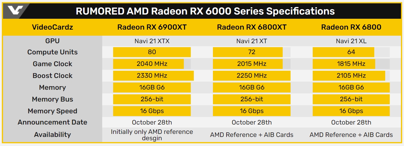 У ресурса VideoCardz в канун анонса видеокарт AMD с архитектурой RDNA 2 появляется отличная возможность оправдывать своё название несколько раз в день. С понедельника, по словам источника, партнёры AMD начали получать новую информацию об ассортименте видеокарт серии Radeon RX 6000 и их характеристиках. Это позволило представителям ресурса сформировать свежий вариант сводной таблицы.