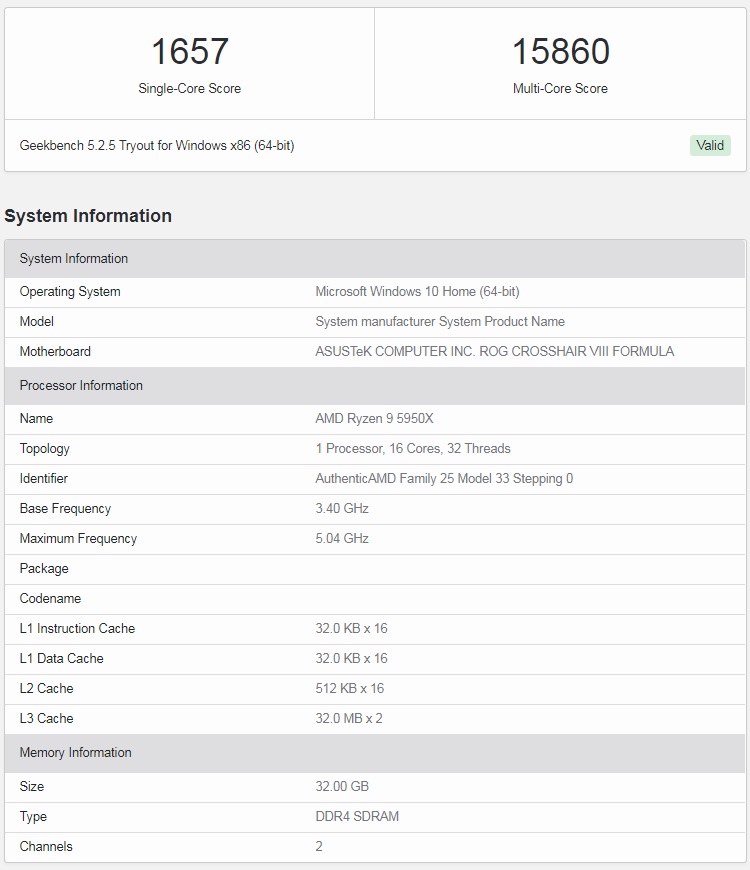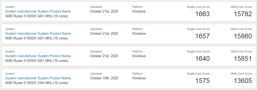 В тесте AMD Ryzen 9 5950X набрал 1657 баллов в одноядерном и 15860 баллов в многоядерном тесте ЦП. Сравнивая эти цифры с флагманским 18-ядерным HEDT-процессором Intel Core i9-10980XE видно превосходство Ryzen 9 5950X на 43% в одноядерных и на 7,5% в многоядерных тестах.