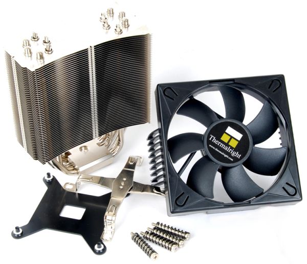 Судя по всему, желающие могут установить ещё один такой вентилятор с другой стороны радиатора за дополнительную плату. Характеристики радиатора давно нам знакомы: при размерах 133 х 156 х 38 мм он имеет массу 790 гр. В зависимости от типа разъёма на материнской плате (LGA 1366, LGA 775 или Socket AM2+), кулеры с суффиксом RT комплектуются соответствующим набором крепёжных элементов и вентилятором типоразмера 120 мм. В варианте для платформы LGA 1366 он имеет скорость вращения 1600 об/мин и уровень шума 28 дБА, а версии для платформ LGA 775 и Socket AM2+ имеют вентилятор со скоростью вращения 1000 об/мин и уровнем шума 15.8 дБА.