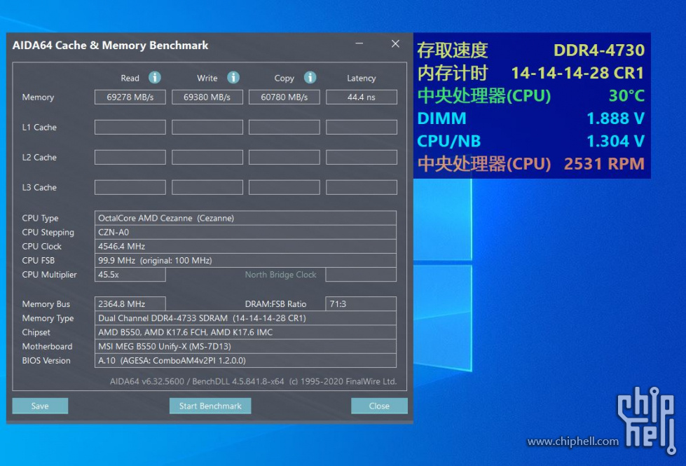 Вычислительная производительность инженерных образцов новых APU Cezanne оказалось не хуже, чем у родственного семейства Vermeer. Теперь дело дошло и до экстремального испытания возможностей встроенного контроллера памяти (IMC). Неизвестно, получили ли Ryzen 5000G какие-либо архитектурные улучшения, AMD пока не раскрывает никакой информации. Один из пользователей китайского форума ChipHell отметил, что возможности IMC в Ryzen 7 5700G гораздо выше, чем у представителей Renoir. Оперативную память на MSI MEG B550 UNIFY-X удалось разогнать до 5333 МГц при таймингах 18-24-24-46-1T и напряжении 1,74 В, что является очень высоким показателем. Шина Infinity Fabric работала в асинхронном режиме.