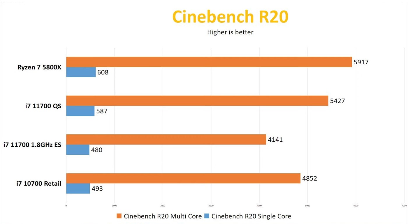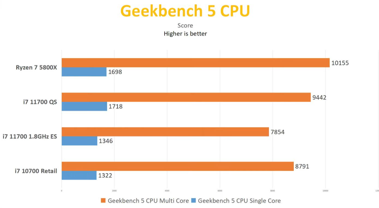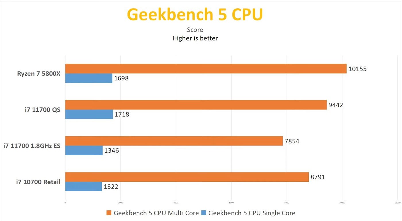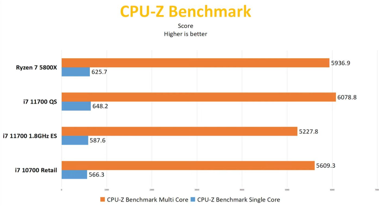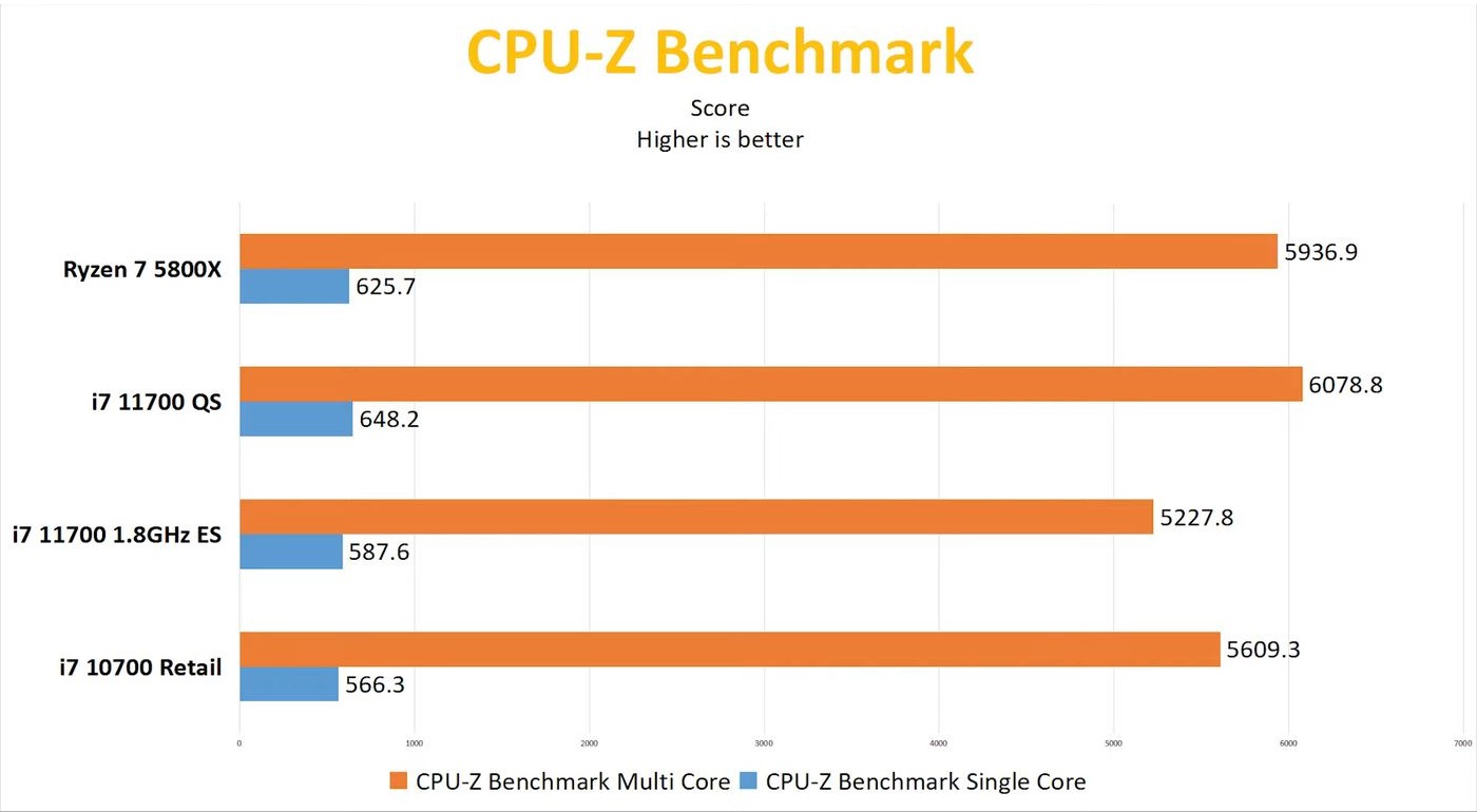 В ряде бенчмарков и тестовых утилит настольный процессор Intel Core i7-11700 продемонстрировал неоднозначные результаты, обогнав AMD Ryzen 7 5800X в однопоточном и многопоточном тесте CPU-Z на 3.6 и 2.4 %, а также в однопоточной дисциплине Geekbench 5 (+1,2 %), выступив практически на равных в кодировании медиафайлов посредством Handbrake и рендере тестовой сцены «BMW» в Blender, однако уступив в той же утилите при отрисовке сцены «Classroom» (-4,5 %), отстав в бенчмарке Cinebench версий R15 и R20 на 6,2/3,5 и 12,3/8,3 % в однопоточном/многопоточном состязаниях, а также оказавшись позади в многопотоке Geekbench 5 (-7,0 %).