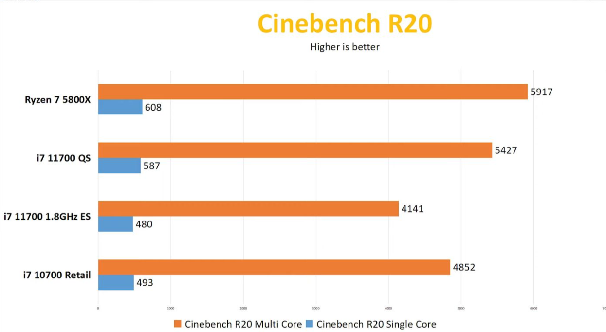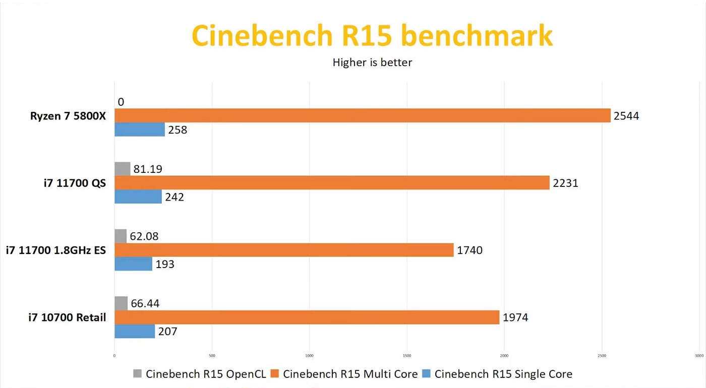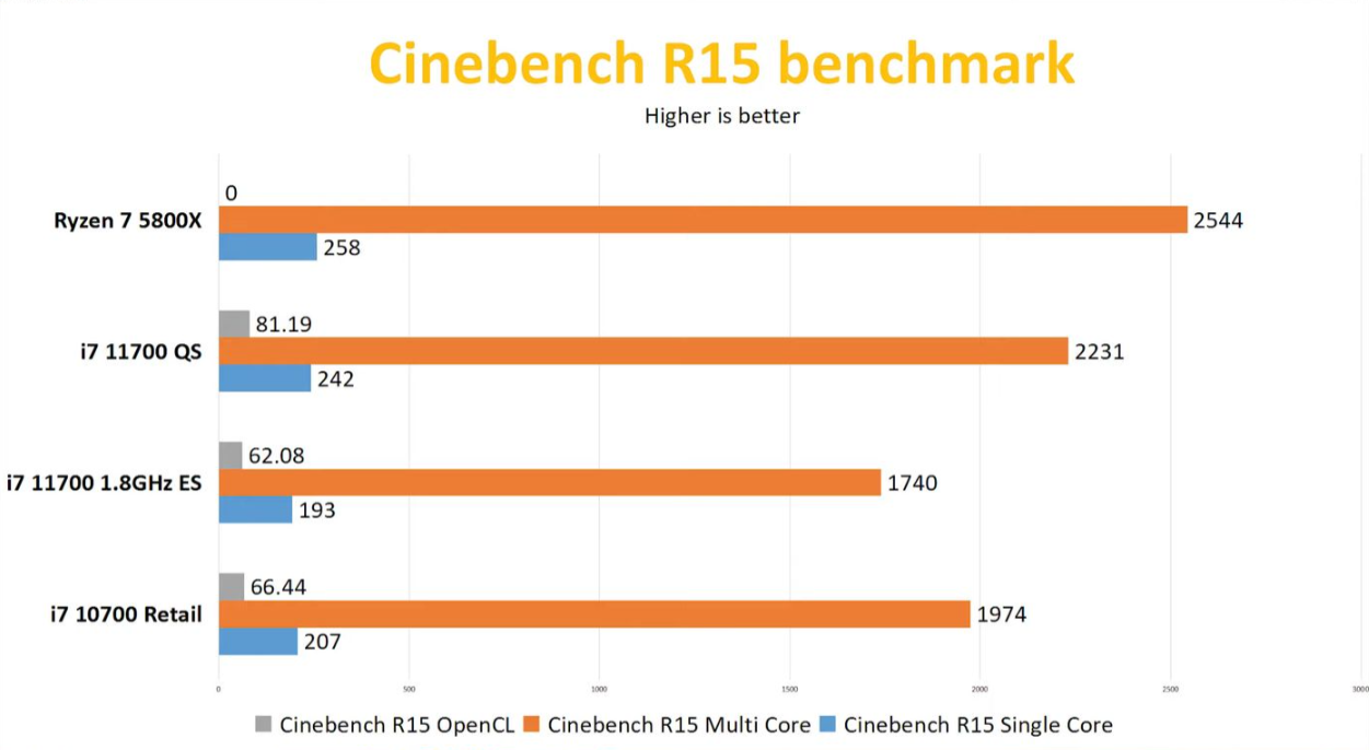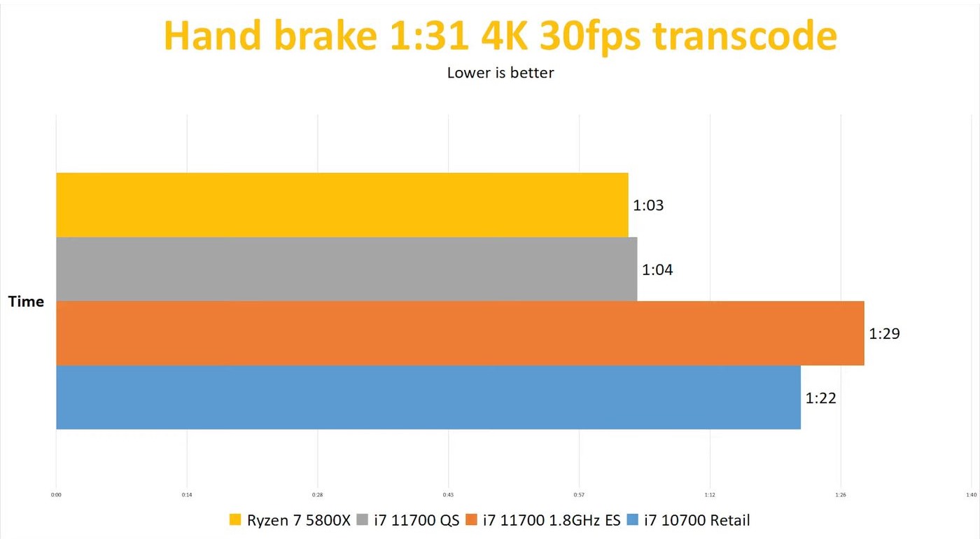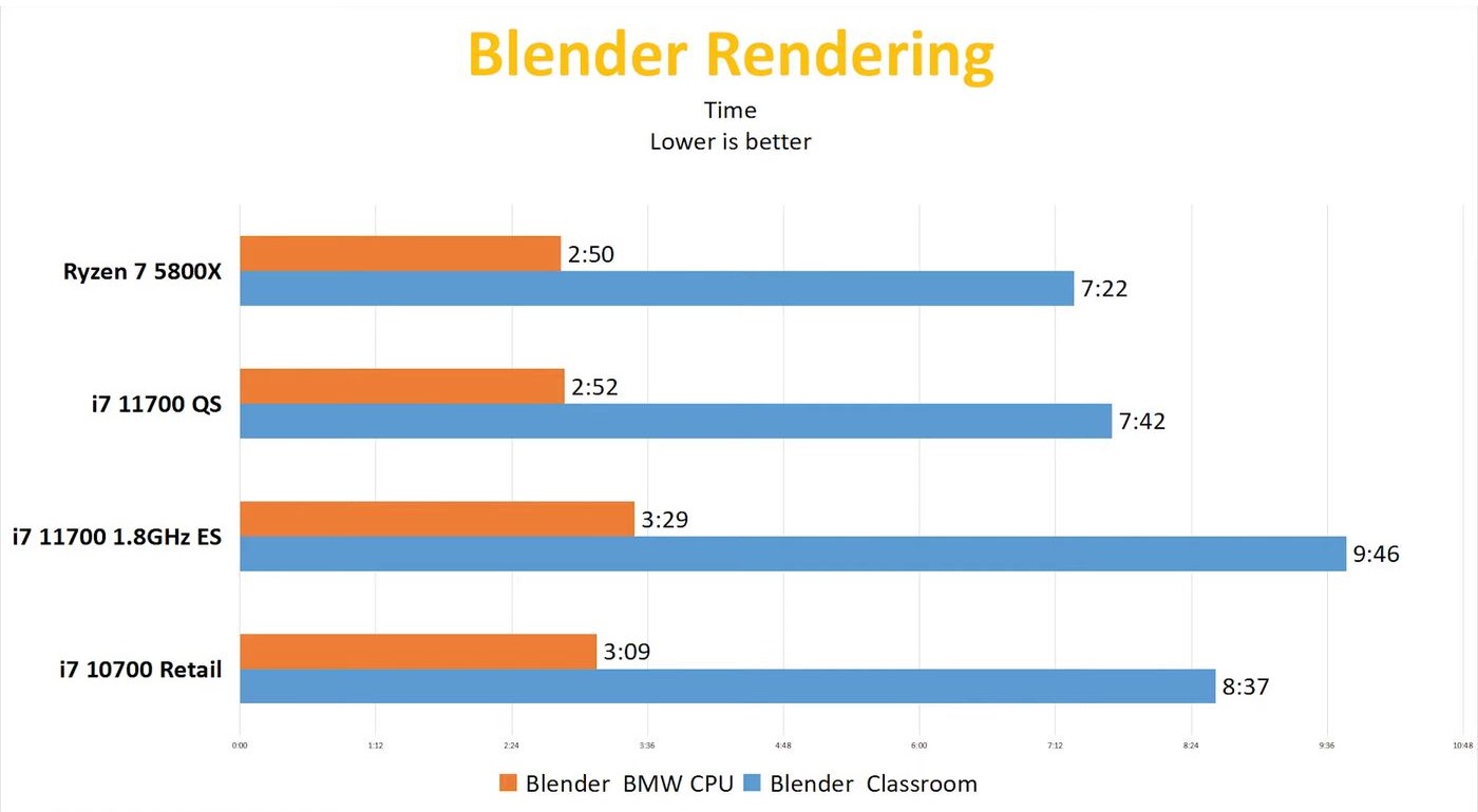 В ряде бенчмарков и тестовых утилит настольный процессор Intel Core i7-11700 продемонстрировал неоднозначные результаты, обогнав AMD Ryzen 7 5800X в однопоточном и многопоточном тесте CPU-Z на 3.6 и 2.4 %, а также в однопоточной дисциплине Geekbench 5 (+1,2 %), выступив практически на равных в кодировании медиафайлов посредством Handbrake и рендере тестовой сцены «BMW» в Blender, однако уступив в той же утилите при отрисовке сцены «Classroom» (-4,5 %), отстав в бенчмарке Cinebench версий R15 и R20 на 6,2/3,5 и 12,3/8,3 % в однопоточном/многопоточном состязаниях, а также оказавшись позади в многопотоке Geekbench 5 (-7,0 %).
