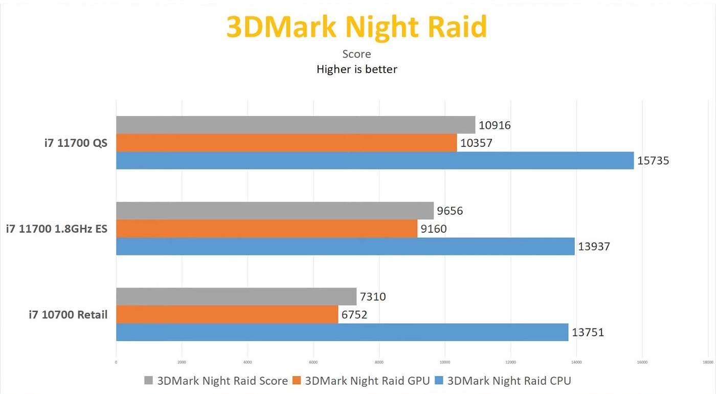 Уровень производительности встроенной графической подсистемы новинки в сравнении с результатами iGPU модели прошлого поколения также впечатляет: так, графический тест пакета 3DMark Night Raid продемонстрировал превосходство iGPU с архитектурой Xe на 53,4 %.