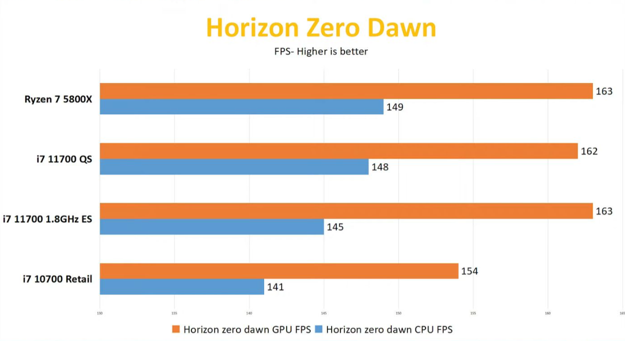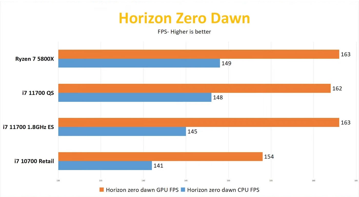 В игровых приложениях Core i7-11700 также выступал против Ryzen 7 5800X с переменным успехом: в игре Hitman 2 представитель «синей команды» уступил своему оппоненту 19,6 %, в Horizon Zero Dawn выступил на равных, а в Dirt 5 и Shadow of the Tomb Raider по значению кадровой частоты (GPU FPS) обогнал соперника на 3,0 и 13,6 % соответственно.