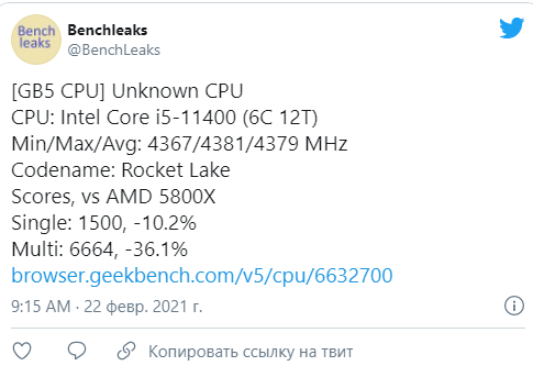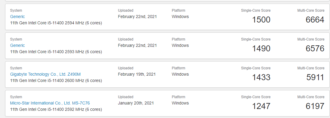 В базе данных бенчмарка Geekbench появился результат Core i5-11400 — это самый младший представитель Rocket Lake-S, обновленные i3 будут относиться к старому поколению, поэтому i5-11400 станет самым бюджетным вариантом для построения новой системы и, как правило, эти модели i5 пользуются наибольшим спросом у покупателей.