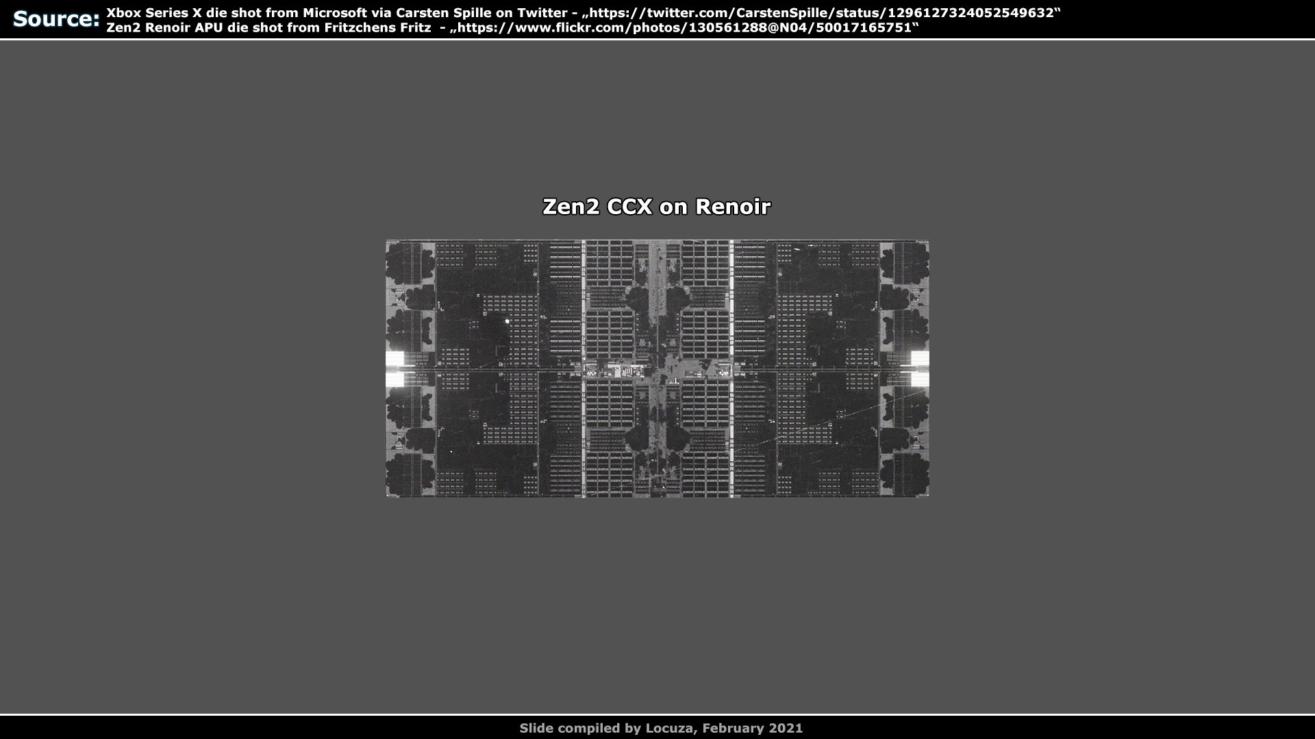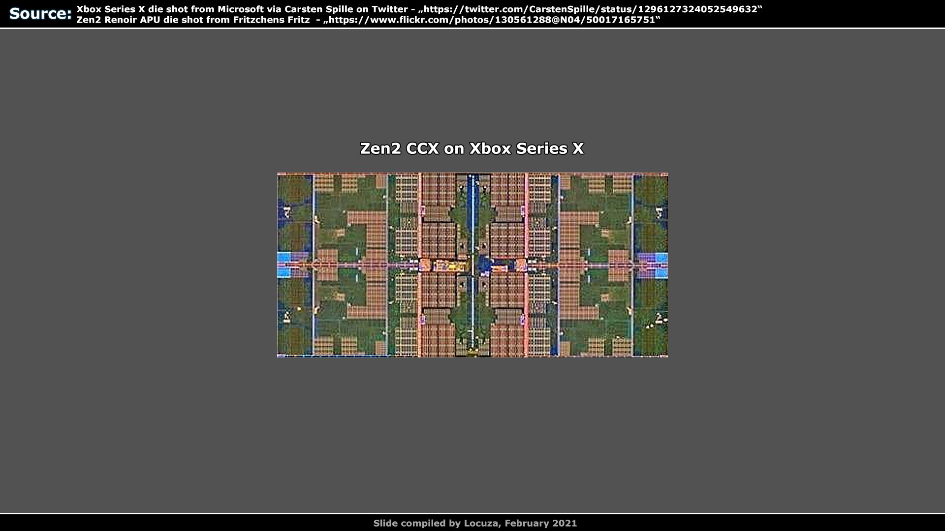 Специалист, известный в Twitter под псевдонимом @Locuza_, опубликовал результаты своего исследования процессорной части чипа во флагманской игровой консоли от Microsoft. Выводы основаны на подробных фотографиях, а также схемах, опубликованных в официальных презентациях Microsoft. По оценке специалиста, у процессорной части чипа Xbox Series X и APU AMD семейства Renoir те же размеры ядер и комплексов CCX, тот же дизайн и реализация.