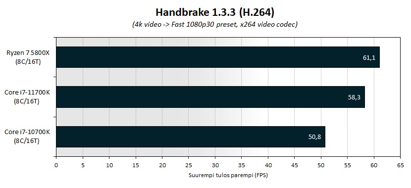 Что касается непосредственно результатов тестов, то на фоне своего предшественника Core i7-11700K выглядит вполне неплохо, в то время как отставание от конкурента из стана AMD в ряде задач ощутимо: так, в однопоточном/многопоточном подтестах бенчмарка Cinebench R20 Ryzen 7 5800X обогнал своего оппонента на 2.8/5.9 %, а в задачах кодирования медиафайлов посредством Handbrake 1.3.3 был быстрее на 4.8 %.