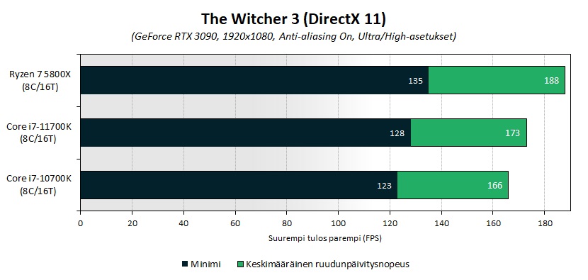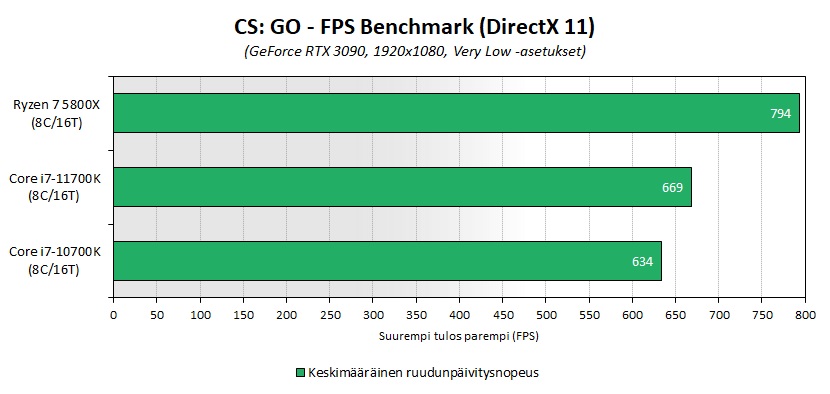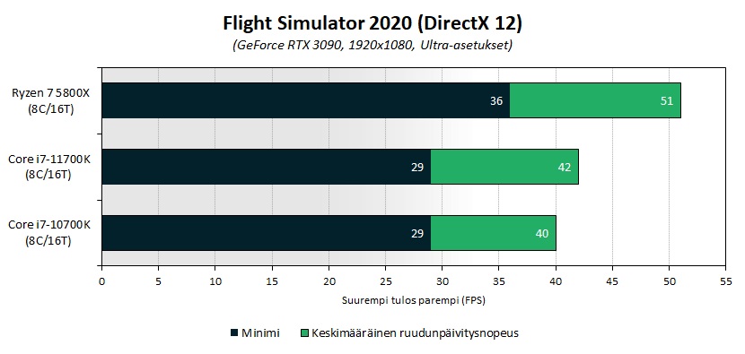 В игровых приложениях для Core i7-11700K всё сложилось не слишком удачно: если по параметру средней кадровой частоты в тайтлах Shadow of the Tomb Raider, Metro Exodus и Total War: WARHAMMER II между новыми моделями Intel и AMD наблюдался практически паритет, то в Assetto Corsa Competizione, Microsoft Flight Simulator 2020, The Witcher 3, F1 2020 и Counter-Strike: Global Offensive представитель архитектуры Zen 3 был производительнее на 5.9, 21.4, 8.7, 4.3 и 18.7 % соответственно.