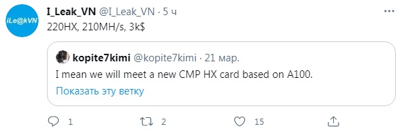 Как сообщает инсайдер, известный под ником I_Leak_VN, дополняющий информацию энтузиаста kopite7kimi, топовое устройство, предназначенное для майнинга криптовалют и являющееся аналогом ускорителя вычислений NVIDIA A100, получит кодовое имя CMP 220HX, а скорость хешрейта при майнинге Ethereum достигнет значения в 210 MH/S, что почти вдвое больше достижений GeForce RTX 3090.