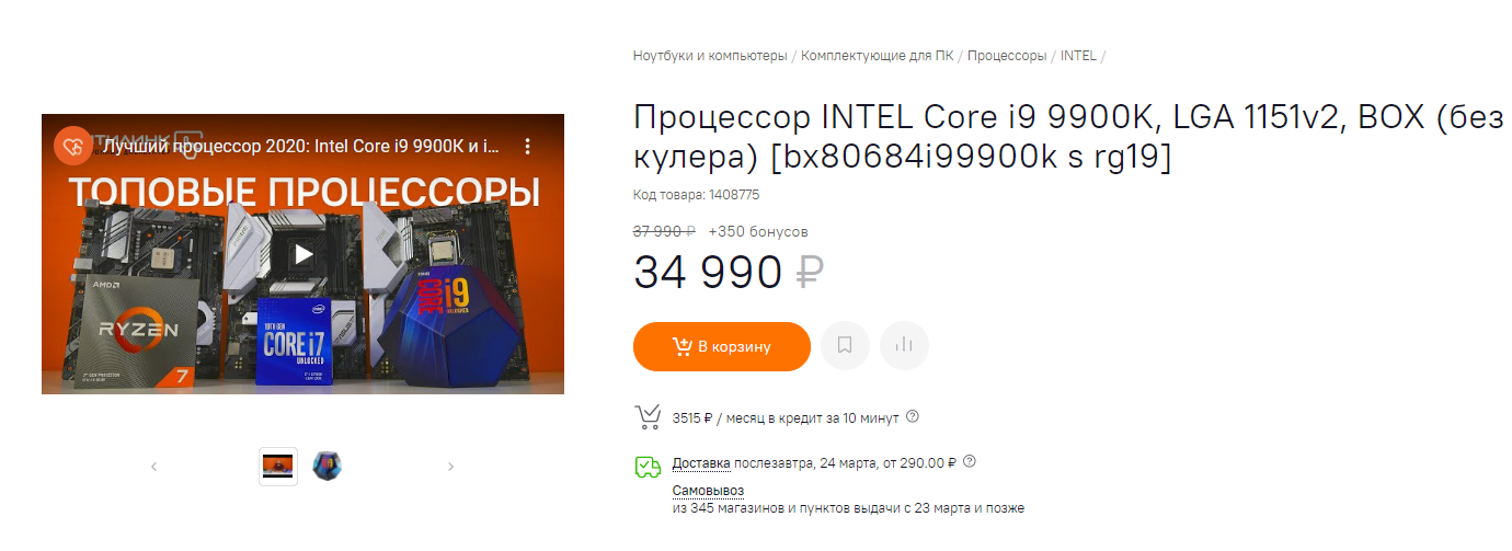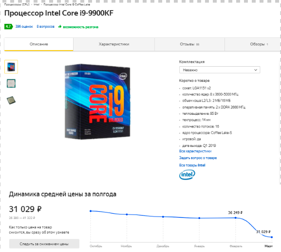 Ещё более интересен Core i9 - 9900KF. Эта версия лишена графического ядра, что не мешает её демонстрировать одни из лучших показателей скорости на рынке. В последнее время стоимость такого процессора постоянно снижалась, опустившись на 5 тысяч за один месяц. В итоге Регард предлагает купить скоростной 8-ядерник, способный с лёгкостью достигает 5 ГГц всего за 31 680 рублей. Повторимся, за эту сумму у красных в лучшем случае Ryzen 7 3700X, который уступает 8-ядернику Intel с большим отрывом в реальных играх.