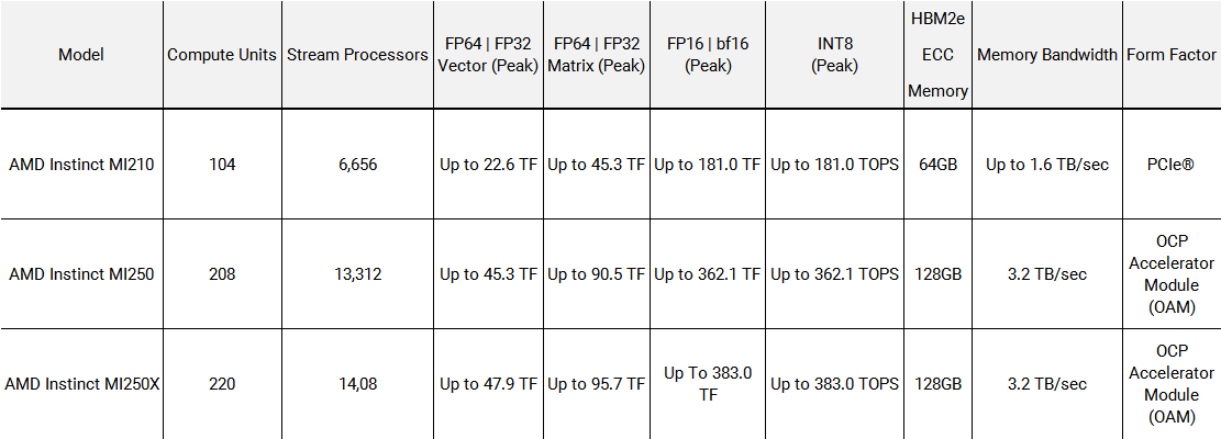 При частоте 1700 МГц производительность MI210 в векторных операциях FP64 и FP32 достигает 22,6 Тфлопс, а в матричных — 45,3 Тфлопс. Новая архитектура отличается наличием специальных «матричных ядер» Matrix Core. Пиковая производительность при работе с форматами FP16, Bfloat16 достигает 181 Тфлопс и столько же Топс при работе с форматом INT8. Подсистема памяти представлена четырьмя стеками HBM2e с общим объёмом 64 ГБ и пропускной способностью 1,6 ТБ/с. Системы с MI210 уже находят применение, например, научные работники компании CSC используют MI210 и изучают их возможности в преддверии полного развёртывания суперкомпьютера LUMI на базе MI250X.