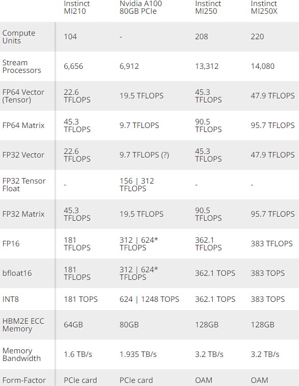 Очевидным конкурентом платы AMD Instinct MI210 является карта PCIe Nvidia A100 емкостью 80 ГБ, выпущенная около года назад. На бумаге решение AMD на основе CDNA 2 превосходит своего конкурента в векторных и матричных операциях FP64/FP32 более чем в два раза. В отличие от этого, Nvidia A80 быстрее с форматами, специфичными для AI/ML, такими как FP16, bfloat16 и INT8.