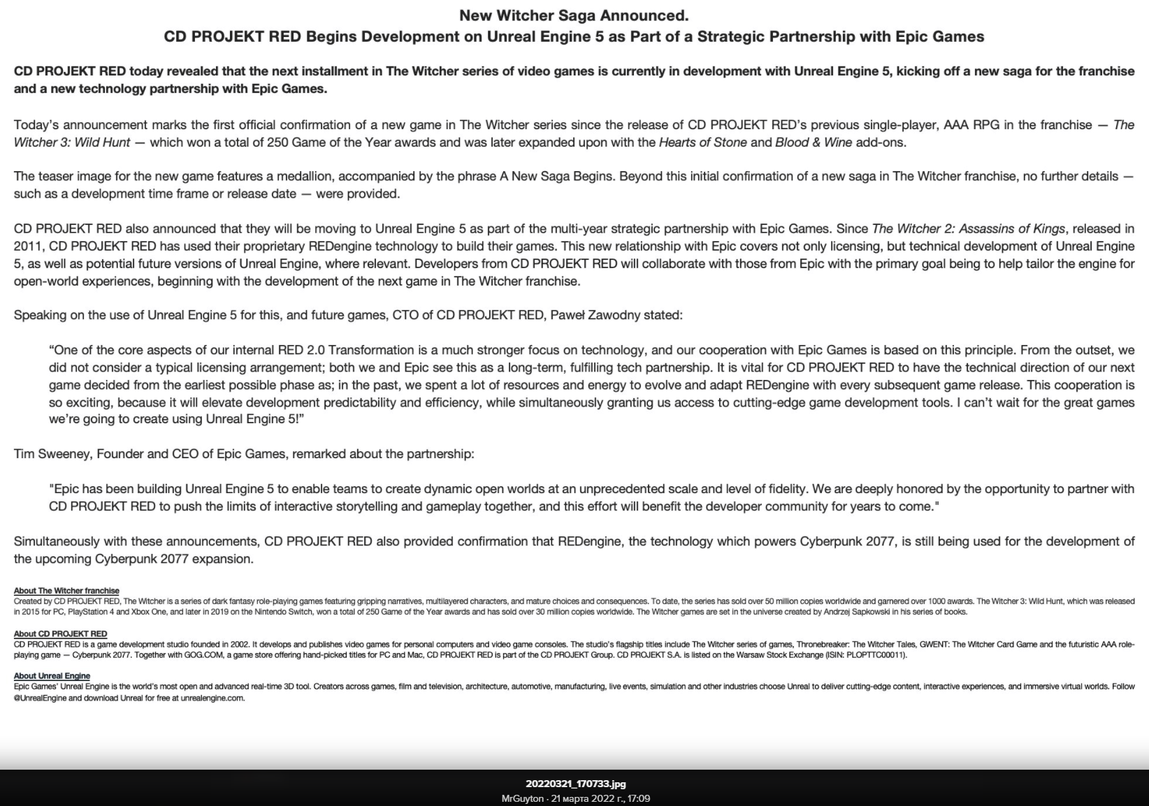 В анонсирующем сообщении на сайте также указывается, что игра будет работать не на базе REDengine, который поляки использовали во всех своих последних проектах. Новый «Ведьмак» будет целиком и полностью построен на Unreal Engine 5, равно как и его «потенциальные будущие версии». CD Projekt RED намерена активно сотрудничать с Epic Games по вопросам внедрения технологий последней в игры студии.
