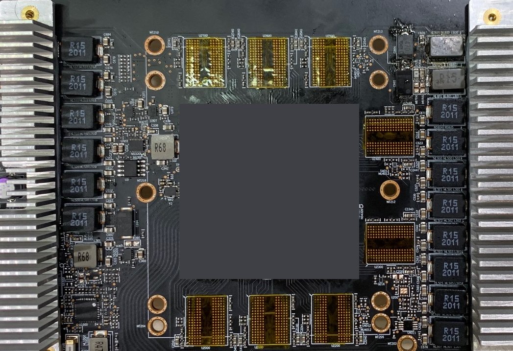 В сети появилось первое фото предполагаемой печатной платы видеокарты AMD Radeon RX серии 6000. Вероятно, это модель на базе графического чипа Navi 21. Графический чип на фотографии закрашен, но большинство остальных элементов можно рассмотреть.