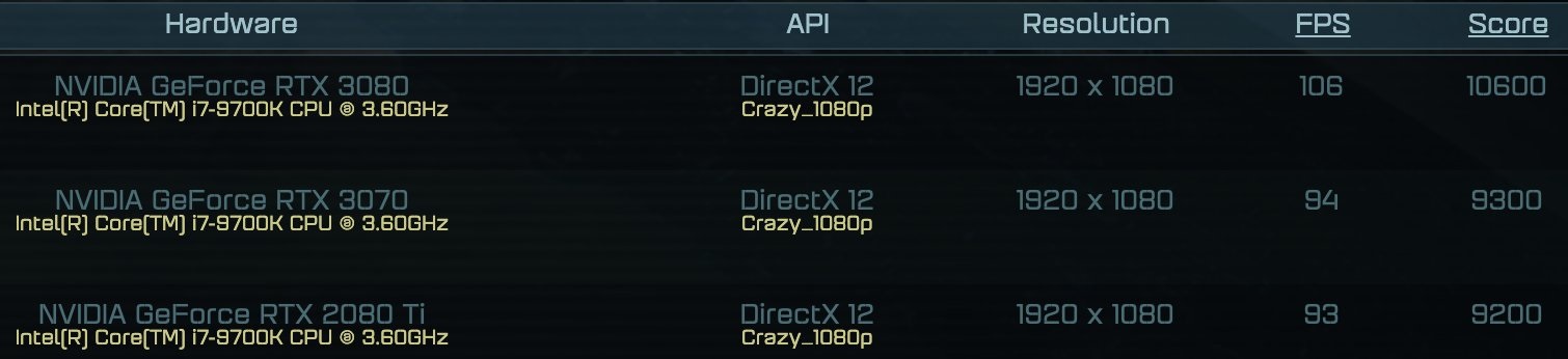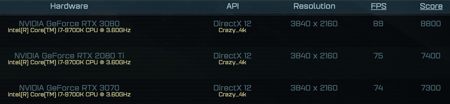 Судя по представленным данным, видеокарта GeForce RTX 3070 была протестирована в трёх разрешениях и показала результаты в 74, 89 и 94 fps при использовании пресетов Crazy_4K, Custom 2560x1080 и Crazy_1080p.