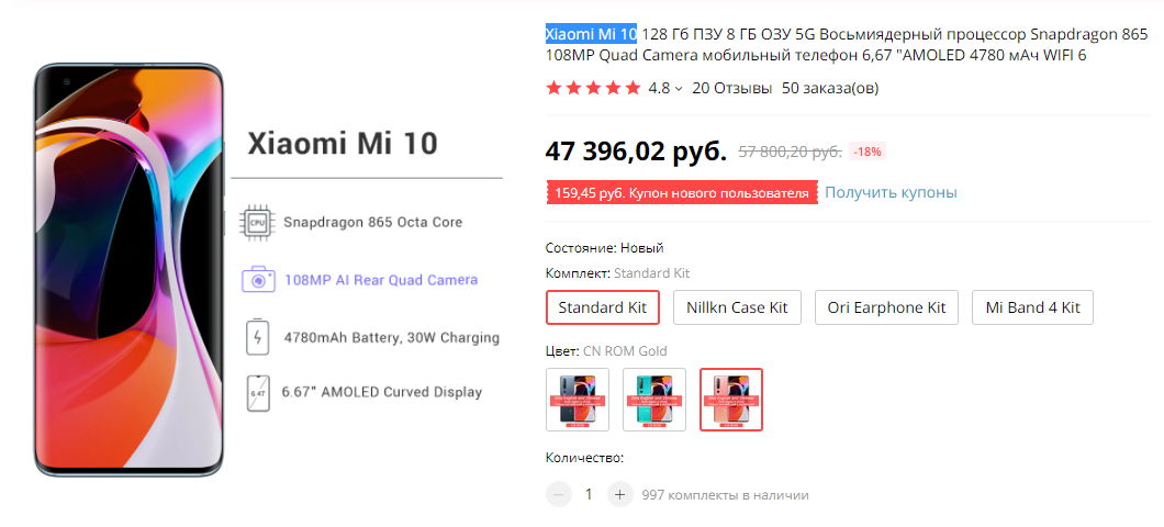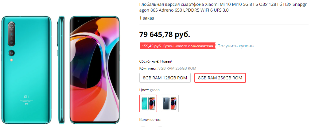 Вообще долгое время продажам Mi 10 мешала высокая цена, которую Xiaomi решила установить на новый смартфон. Например, если зайти на Xiaomi-Global Store, то можно увидеть, что официальная стоимость аппарата приближается к 80 тысячам рублей. Данная цена доступна на Aliexpress. Но это не значит, что нам придётся покупать флагман так дорого, ведь есть отличные предложения от других продавцов. Например, за 47 тысяч, что стало одной из самых низких цен с начала продаж. Если посчитать, то разница составляет немалые 33 тысячи рублей.