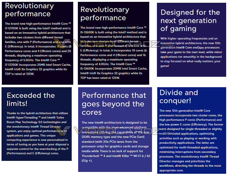 В сети появились маркетинговые материалы Intel с двумя грядущими процессорами: Core i7-12700K и Core i5-12600K. Материалы подтверждают технические характеристики обоих процессоров, включая количество ядер и потоков, а также их максимальную частоту в режиме разгона. Таким образом, подтверждается, что Core i7-12700K получит 12 физических ядер, которые дают в общей сложности 20 потоков и 25 МБ общей кэш-памяти. Эта модель будет иметь базовую частоту для высокопроизводительных ядер 3,6 ГГц с повышением до 5 ГГц, а энергоэффективные ядра получат базовую частоту 2,7 ГГц с возможностью разгона до 3,8 ГГц.