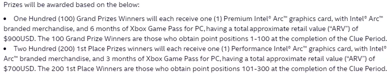 В розыгрыше указаны четыре категории победителей. Главный приз стоимостью 900 долларов достается 100 победителям, которые получат графическую карту Arc Premium и шесть месяцев Xbox Game Pass. 200 призов за первое место следующей категории общей стоимостью 700 долларов включают графическую карту Arc Performance и трехмесячный абонемент Xbox Game Pass. Отняв стоимость абонемента Game Pass и других товаров, включенных в призы, можно получить ориентировочную стоимость видеокарт. Таким образом теоретическая цена графического процессора Arc Performance составляет около 650 долларов, а стоимость Arc Premium можно оценить в 825 долларов, с погрешностью 50-100 долларов.