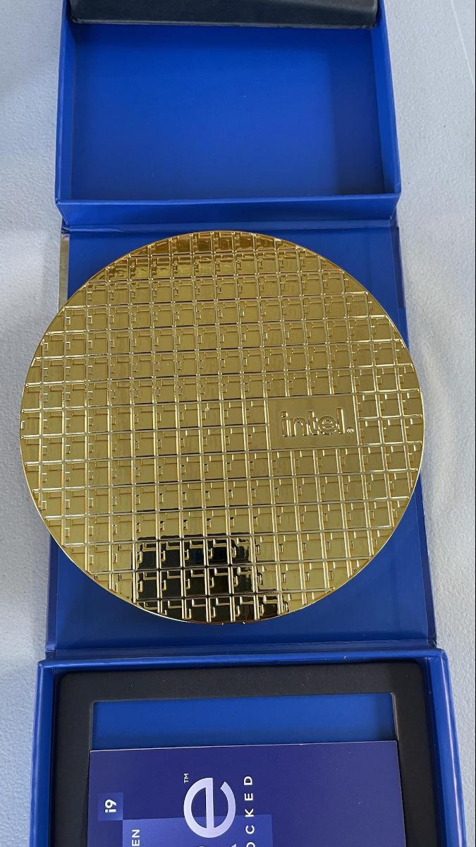 На фото отлично видно состав упаковки. Стоит отметить, что она достойна флагмана. Просторный внешний каркас имеет "гербовые" цвета Intel и должен неплохо защитить содержимое, а внутренняя упаковка круглой формы золотого цвета выполнена в стиле кремниевой пластины. В комплекте также имеется брошюра и наклейка на корпус для гордого владельца. Но фото представлен и сам флагман Core i9-12900K, с нанесенным на крышку кодом SRL4H. Со слов покупателя процессор был приобретен за 610 долларов, но называть магазин он не стал, чтобы не подставлять его.