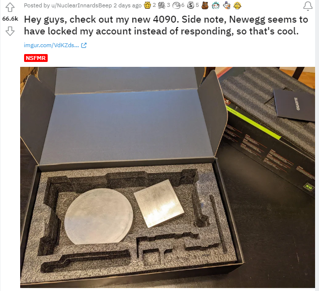 Несколько дней назад на Reddit появилась любопытная история, которая только недавно получила огласку. Как сообщает один из пользователей под ником р/pcmasterrace, он заказал на Newegg видеокарту GeForce RTX 4090. Новый флагман NVIDIA обычно радует геймеров, а не расстраивает, но тут произошло весьма странное, ведь вместо мощного графического чипа внутри коробки были обнаружены два куска металла. Это большой плоский круглый, похожий на шайбу и квадратный брусок, который ранее мог использоваться во время взвешивания небольших грузов в качестве утяжелителей. Как вы уже поняли, никакой GeForce RTX 4090 внутри не оказалось, а обманутый покупатель остался ни с чем. При этом по словам бедолаги, после запроса в Newegg о происходящем с целью вернуть деньги, он столкнулся с блокировкой своего аккаунта в магазине.