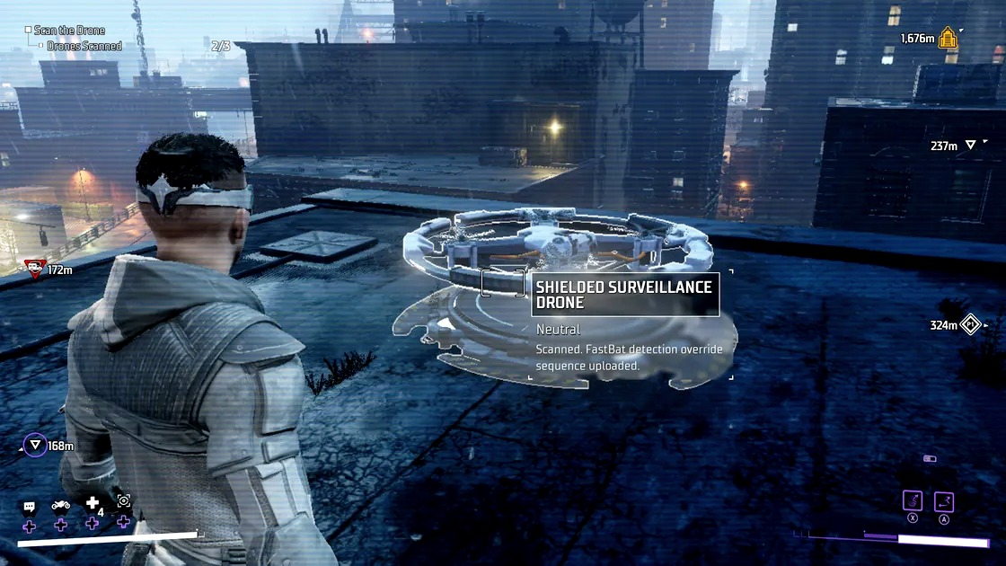 Fox разработала костюм-крыло, который может перевезти вас по городу за считанные секунды, но, конечно, все не так просто. Оказывается, каждый регион Готэма теперь патрулируют дроны GCPD, которые собьют вас, если вы не скомпрометируете их первыми.