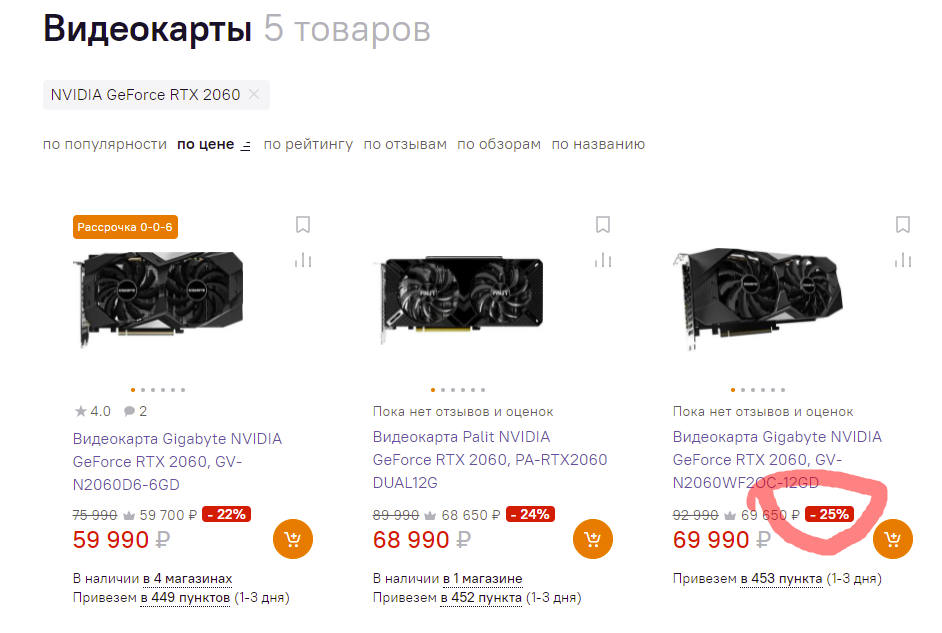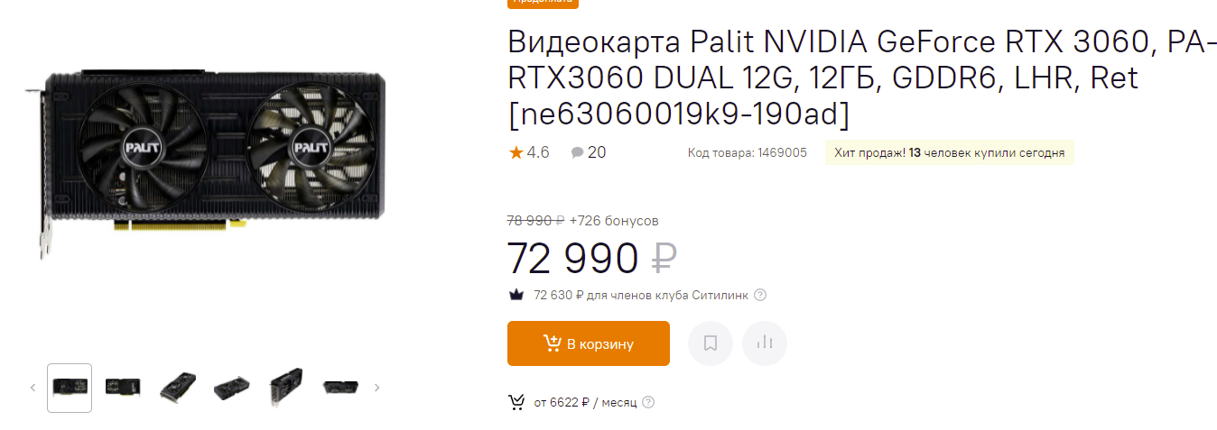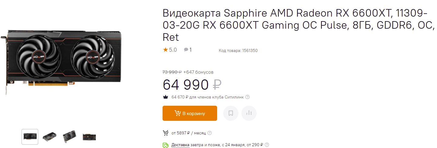 Активно разбирают GeForce RTX 3060, а менее скоростная, но более эффективная в майнинге эфира GeForce RTX 2060 впервые за долгие месяцы стала дешевле предыдущей модели. Сказывается отсутствие спроса со стороны фермеров. Мы снова рекомендуем присмотреться к Radeon RX 6600 XT. Видеокарта стоит 65 тысяч рублей, но крайне интересна в играх. Она даст фору более дорогим моделям NVIDIA и позволяет вообще забыть о существовании майнеров, перекупщиков и дефицита полупроводников на несколько лет.