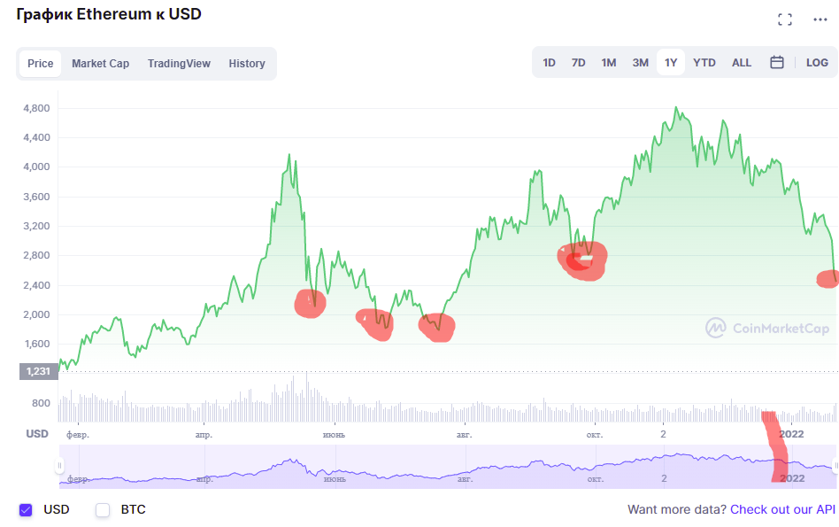 За 2021 год Эфир пережил несколько падений: в мае, июне и июле – когда курс падал ниже 2000 долларов, а после в сентябре, когда он удержался на отметке выше 2500 долларов. Каждый раз, когда это происходило, цены на видеокарты снижались. Иногда перепады были такими быстрыми, что магазины не успевали отреагировать, но как минимум 3 раза вы могли купить видеокарту значительно дешевле её привычной стоимости. Почему же не купили? Просим вас не писать о том, что цены выше рекомендованных. Если вы внимательно читали наши материалы, то должны были бы понимать, что в 2022 году такого понятия как рекомендованная цена не существует. В одном из интервью представители NVIDIA признали, что не могут давить на партнёров, поскольку те сталкиваются с дефицитом ключевых деталей, каждая из которых достаётся им крайне дорого. Именно поэтому цены ещё долго не вернутся в норму, но это не значит, что нельзя купить видеокарту дешевле, чем вчера.