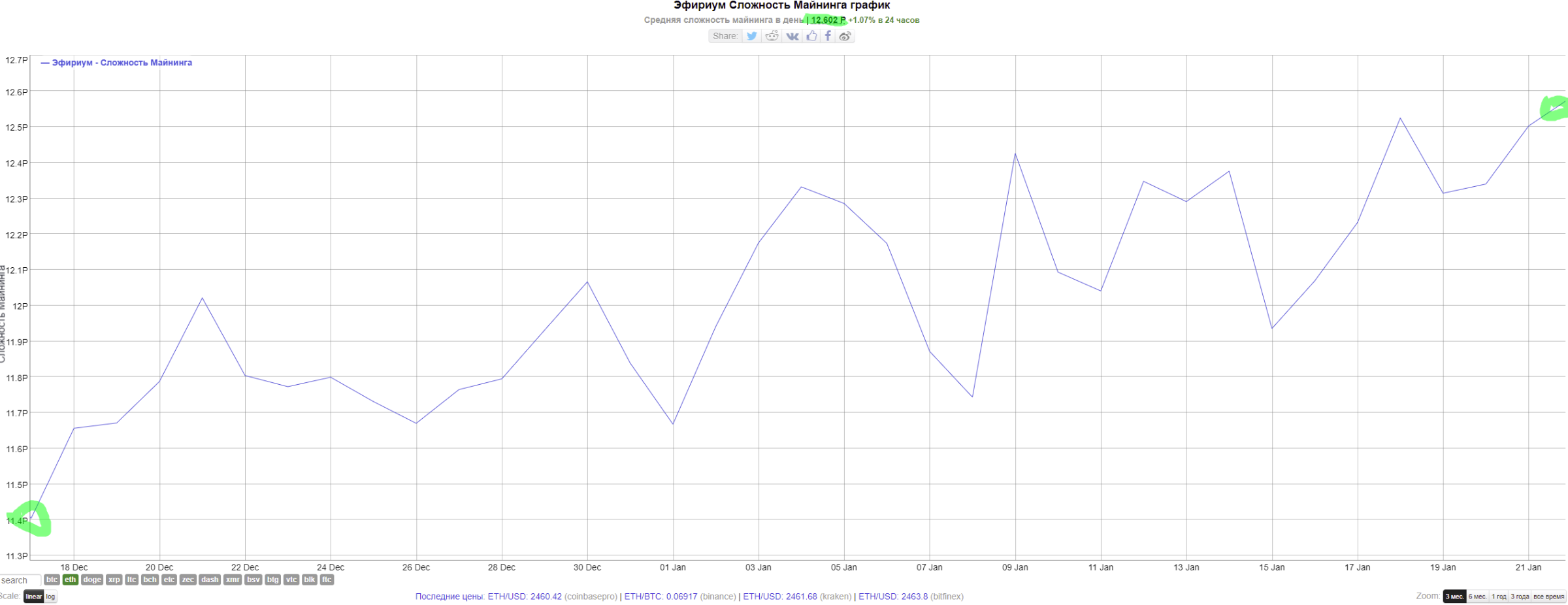 Все наши читатели знают о том, что Эфир уже несколько недель дешевеет. Эксперты указывают на изменения монетарной политики ФРС, а также на планы Центробанка запретить хождение криптовалют на территории России. Всё это отдалённая перспектива, а любые решения будут иметь далекоидущие последствия. И всё же, если говорить о происходящем на рынке сегодня, то крайне удивительной кажется тенденция роста сложности добычи Эфира. Обратите внимание на график ниже. Как видите, на 18 декабря хешрейт сети составлял 11.4 Р, в то время как сегодня он равен 12.6 Р. Забавно, что падение стоимости Эфира не только не снизило количество майнеров, но и привело к покупке нового оборудования.