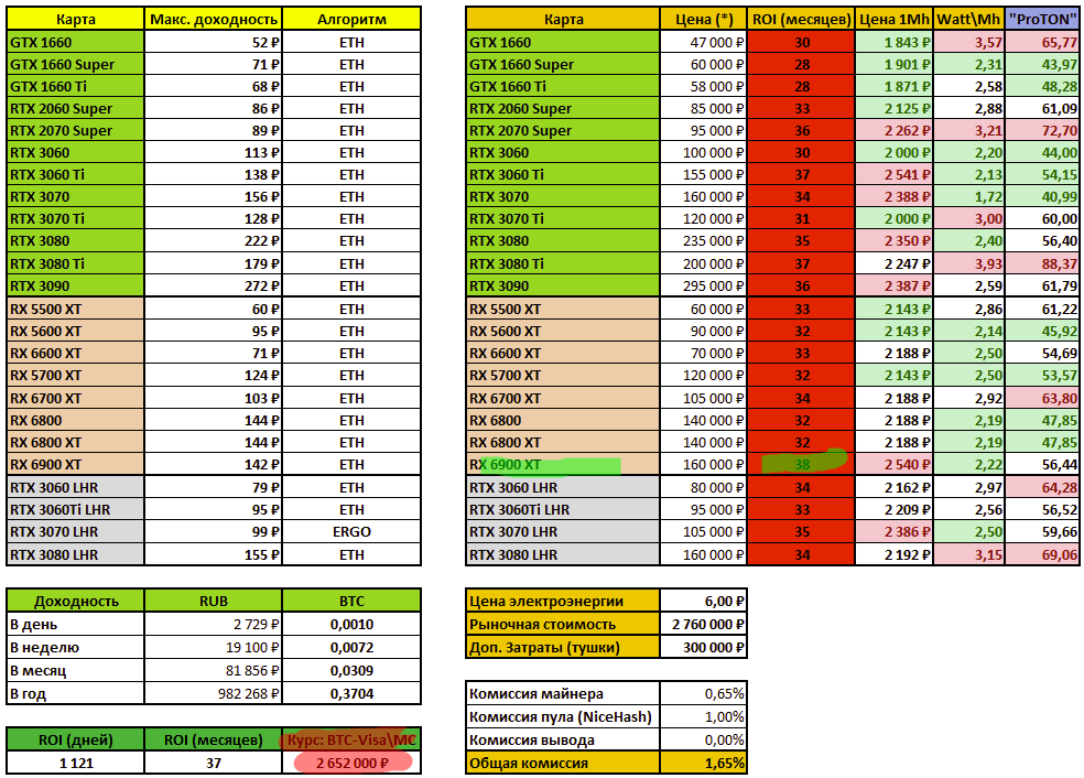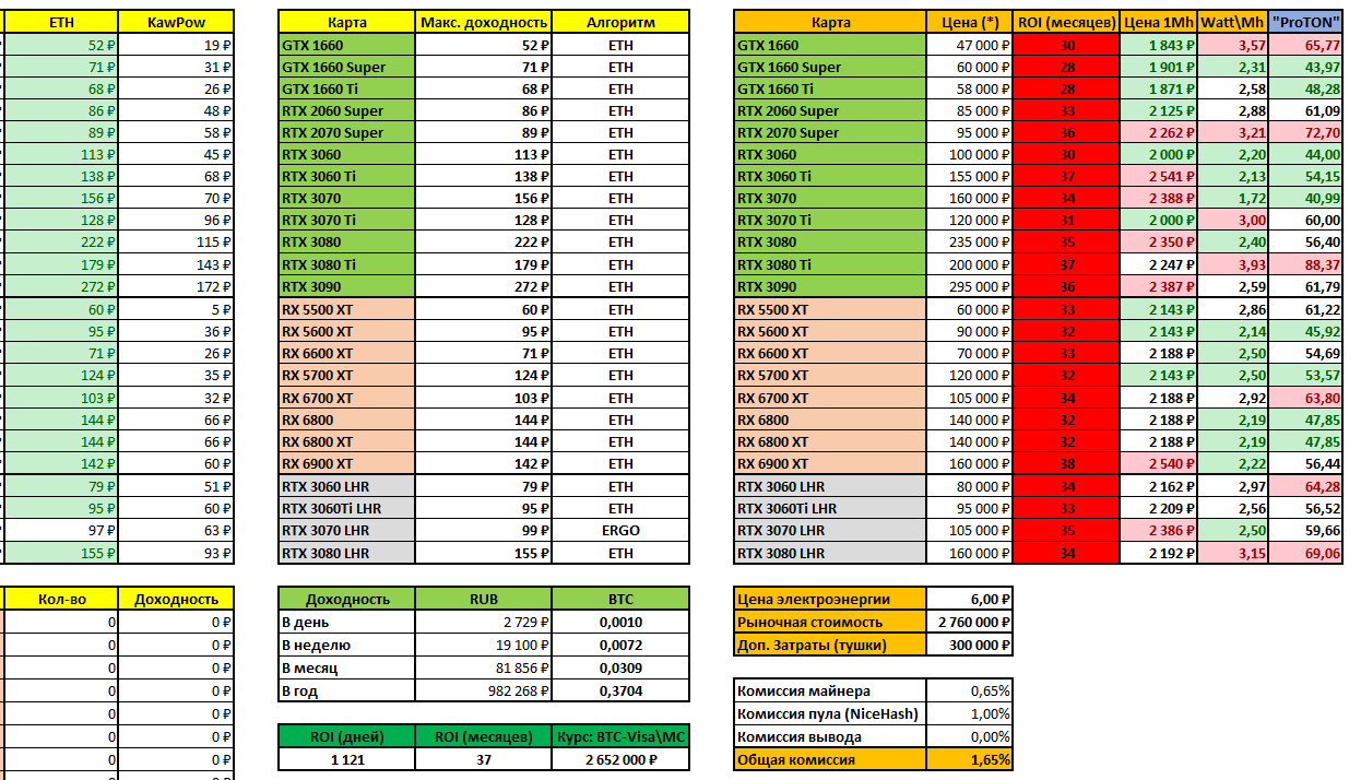 Получается, что фермеры решили воспользоваться небольшим падением стоимости видеокарт для наращивания мощностей для добычи Эфира. Что же, если вы как раз думали о покупке нескольких видеокарт, то спешим вас предостеречь, ведь в реальности всё очень плохо. Ниже можно изучить таблицу с данными, опубликованными на канале ProTON. Заранее отметим, что блогер считал цену Эфира по 2652 доллара за монету, в то время как сегодня криптовалюта торгуется гораздо ниже. Именно поэтому итоговые значения в таблице на самом деле немного неточны, ведь всё куда хуже, чем может показаться.